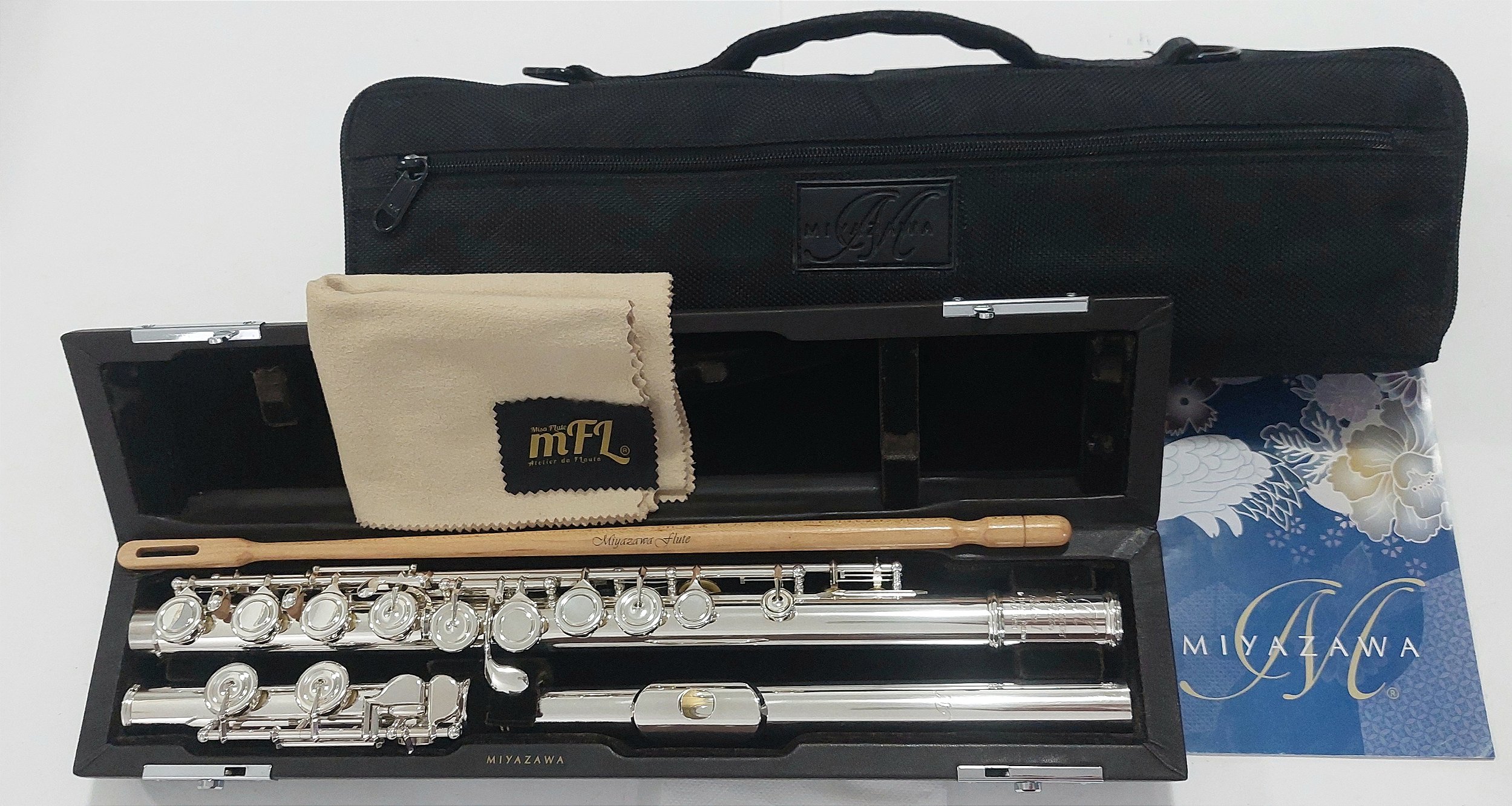SEMINOVO, Made in Japan, Feito à mão, Bocal MZ 10 PRATA 925, Riser 990, Corpo e mecanismo banhado a prata, Point Arms Key, Brögger System, sem pinos, Sapatilhas MZ Straubinger, Molas em ouro branco, chaves fechadas, Mi mecânico, Pé em DO